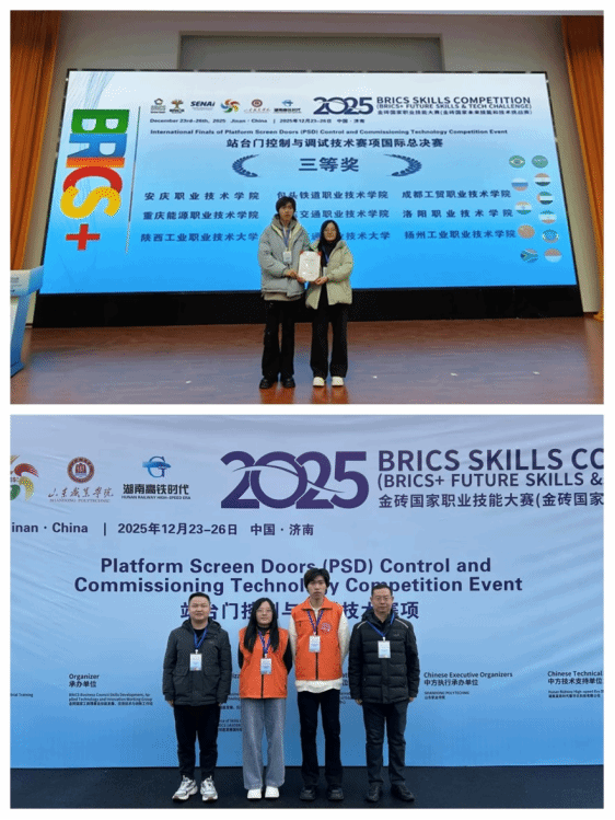 近日,2025年金砖国家职业技能大赛国际总决赛“站台门控制与调试技术赛项”在山东济南圆满落幕。来自中国赛区30余所高校的顶尖选手同台竞技,我校土木工程学院穆思璇、陆旭城同学在指导教师张海、黄春晖的悉心指导下,凭借扎实的专业功底、娴熟的实操技能与沉稳的应变能力,历经6小时高强度比拼,最终斩获该赛项三等奖,充分展现了我校学子精湛的技术素养与昂扬向上的职业风采。