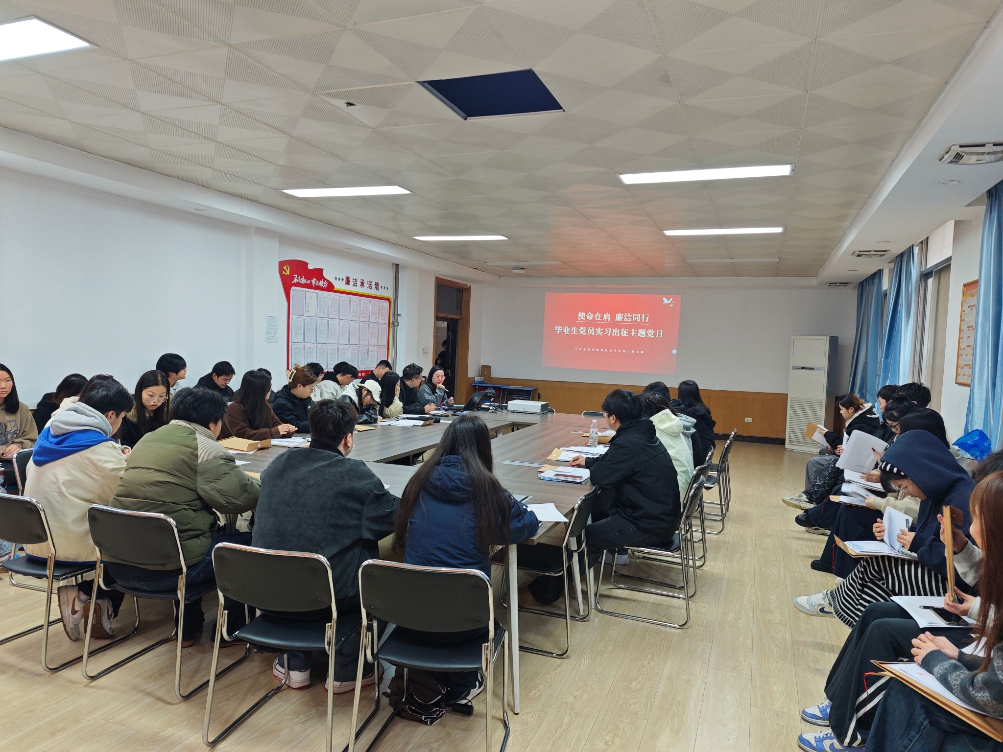 为引导毕业生党员在职业生涯起步阶段就树立正确的权力观、利益观,活动精心安排了纪律警示教育环节。学院特邀一位在大型工程项目一线工作的优秀校友党员,通过线上连线的方式,为大家带来一堂生动的“一线声音”廉洁微课堂。校友结合自身经历和行业典型案例,深入剖析了工程建设领域可能面临的廉洁风险点,语重心长地告诫学弟学妹们要时刻保持清醒头脑,坚守职业道德底线,做到“慎初、慎微、慎独”,系好廉洁从业的“第一粒扣子”。