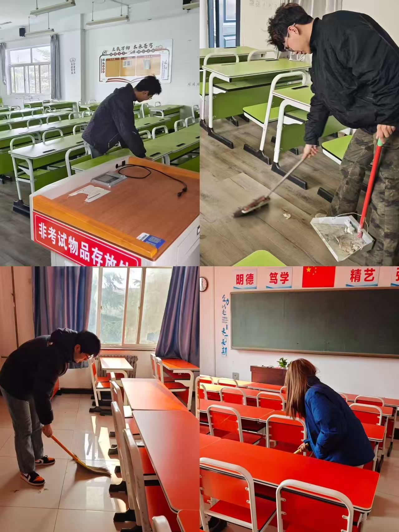 连续四天,积极分子们准时到岗,默契配合,认真履行清洁职责。从擦拭黑板讲台到整理桌椅,从清扫地面到检查设施,每一个环节都一丝不苟。尽管午休时间紧张,但同学们毫无怨言,用实际行动诠释了“奉献、友爱、互助、进步”的服务精神。四天累计出动服务小组76组次,参与积极分子152人次,高质量完成了全部考场的午间清洁维护任务,为近2000名考生提供了整洁舒适的考试环境。