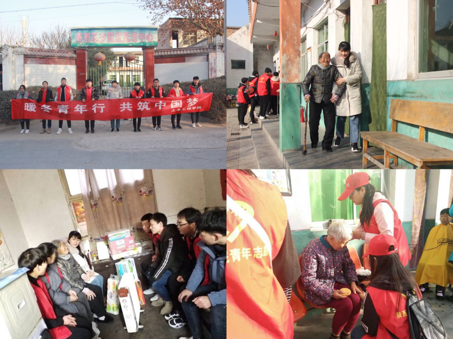 土木学院学工办主任韩二豹对本次社会实践活动规划做了具体指导,9名同学在郭岩老师的带领下前往秦都区夕阳红托老中心开展社会实践活动,为孤寡老人送去慰问品和暖心问候。活动中,同学们为老人们发放慰问品、整理房间、打扫卫生、清洗衣物、促膝交谈,平日里安静的敬老院充满了欢声笑语,同学们热情周到的服务和无微不至的关怀,让每一位孤寡老人在寒冷的冬天感受到阵阵温暖。