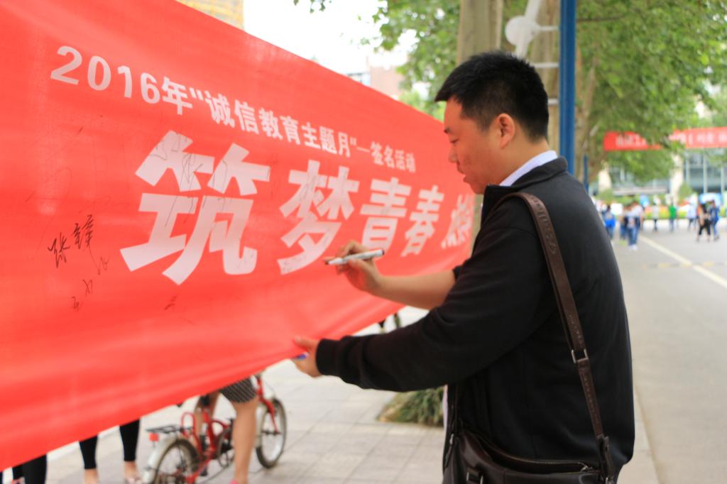 5月9日至16日,土木工程学院开展以“筑梦青春,诚信同行”为主题的系列教育活动,通过每周例行班会、集体签名、主题展览等形式,结合微信、QQ群、手机短信等资源,组织和动员广大学生积极参与,营造了有广度、有深度、有温度的“讲诚信、知感恩”氛围。