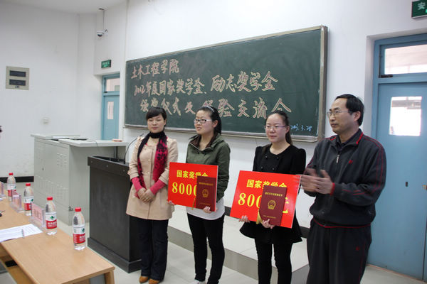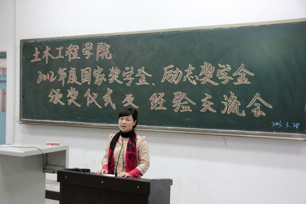 土木学院学工办主任程建卫宣布了2011-2012学年国家奖学金及国家励志奖学金的表彰决定。随后进行了颁奖。土木工程学院党总支书记何克祥、学院资助管理中心主任张艳为获得国家奖学金的杨会会、李庆2名同学颁奖,土木工程学院副院长杨谦、教学办主任王涛等老师为兰富强等42名同学颁发了国家励志奖学金,学院资助管理中心主任张艳介绍了学院资助管理中心在2011-2012年内的相关资助情况并向获奖者表示祝贺。