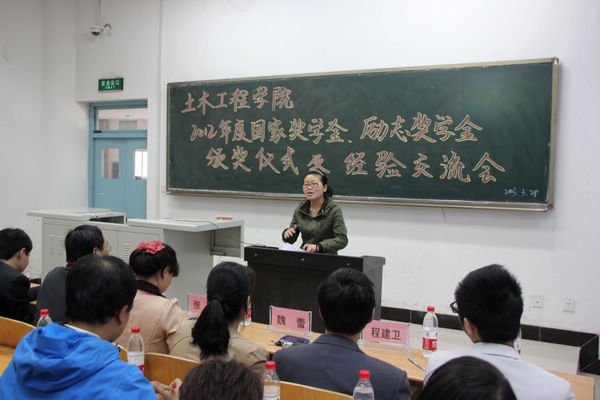为进一步推动学风建设,鼓励学生成才,营造优良学习环境,土木工程学院于3月28日在崇文西楼104教室隆重召开2012年度国家奖学金发放仪式及学习经验交流会。土木学院党总支书记何克祥、副院长杨谦、院学生资助管理中心主任张艳、魏蕾老师,土木学工办所有辅导员及土木学院59个班级二百余名学生代表参加了大会。会议由学工办辅导员宋群芳老师主持。
